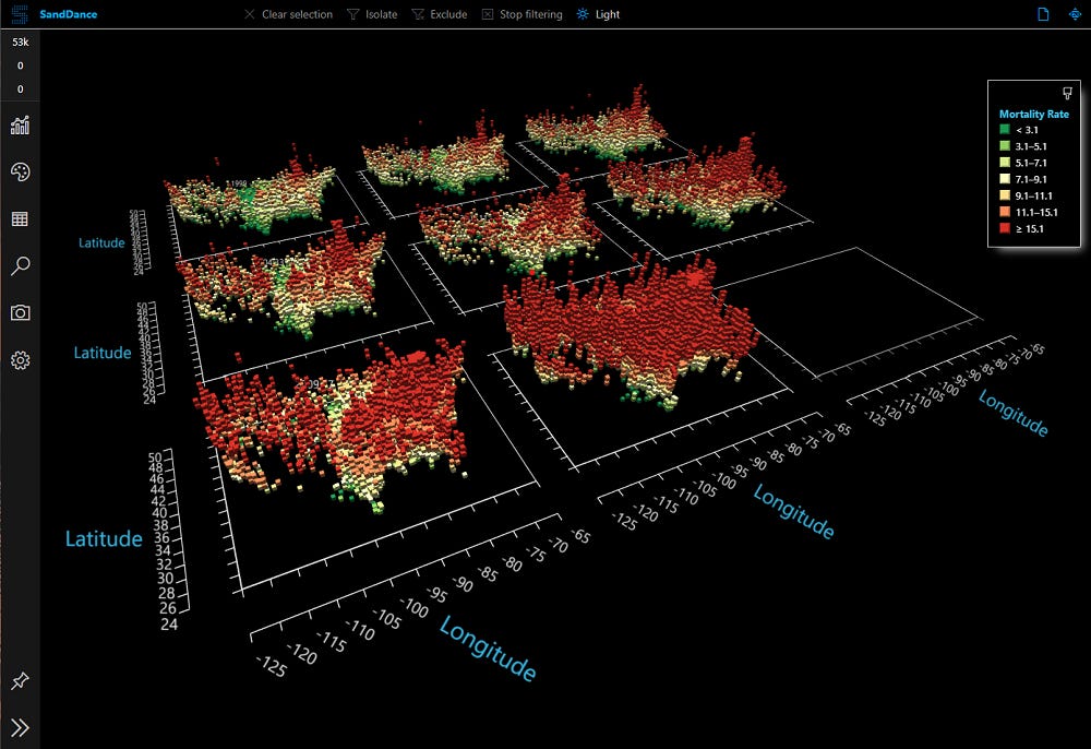 SandDance, the beloved data visualization tool from Microsoft Research, has been re-released as an open source project on GitHub. This new version of SandDance has been re-written from the ground up as an embeddable component that works with modern JavaScript toolchains. The release is comprised of several components that work in native JavaScript or React apps, in addition to using various open source libraries. We hope that with this new architecture, SandDance will be vastly more extensible, enabling new chart types, layers, and interactions, as well as being incorporated into new, vertical applications.