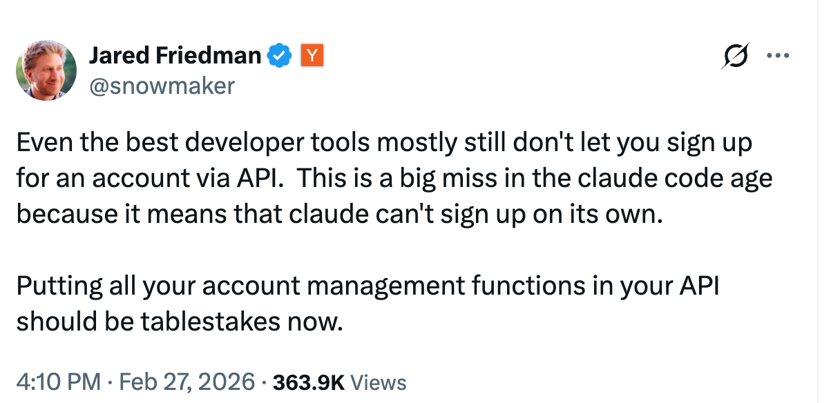 The developer tools that understand this are not treating agent-readiness as a roadmap item for next year. They are rebuilding the front door - signup, access, billing, error handling - as if the first user through it might be a system rather than a person. That is not a small change in how a product is built, but rather in who the product is built for.